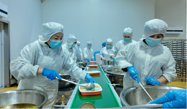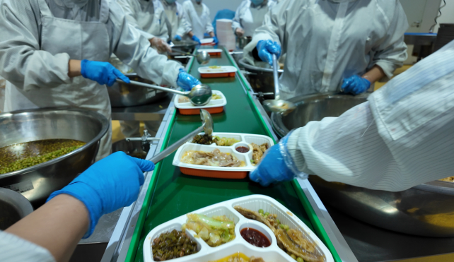 出产线上,十几位工人各司其职,动作熟练而规范。担任装饭的工人手持定量勺,每一份米饭、炒菜、小菜都精准操控重量,装入对应的餐盒格子。通过传送带,餐盒进入快速冲氮设备。“热腾腾的饭菜会敏捷降温到零下,这样能最大极限下降细菌繁殖,保质期只要三天,保证旅客吃到的都是新鲜的。”孔桂连说。