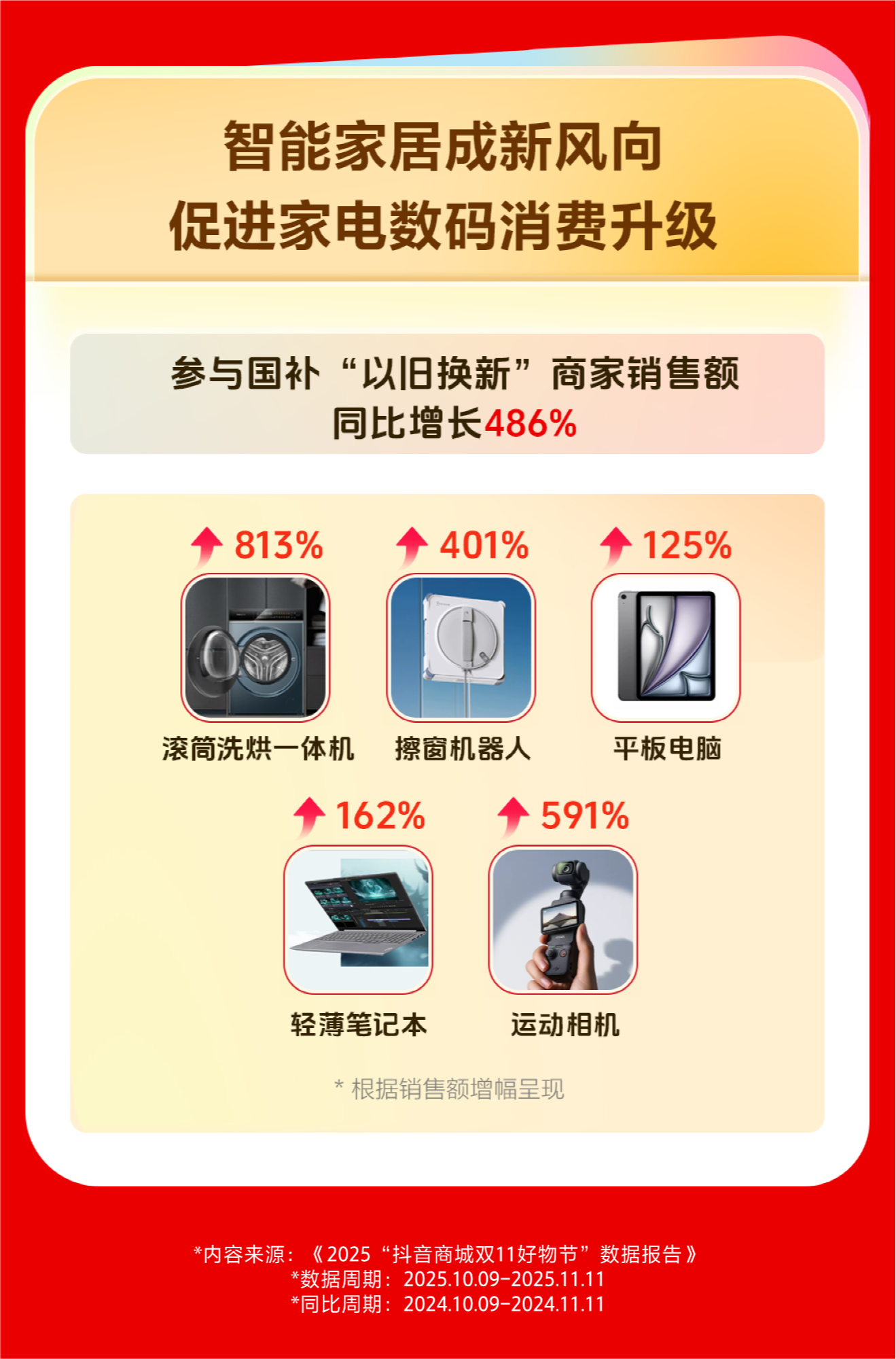 智能家居与数码产品消费也呈现快速地增长。今年“双11”期间,参与“以旧换新”活动的商家销售额同比增长486%,滚筒洗烘一体机、擦窗机器人、运动相机销售额增幅分别达813%、401%和591%,平板电脑与轻薄笔记本也实现125%和162%的增长。与此同时,潮玩市场同样热度攀升,直播销售额超千万元的国潮玩具商家数量同比增长71%,模型机甲、游戏周边、电动遥控玩具、潮流玩具、拼插积木成为最受欢迎的品类。