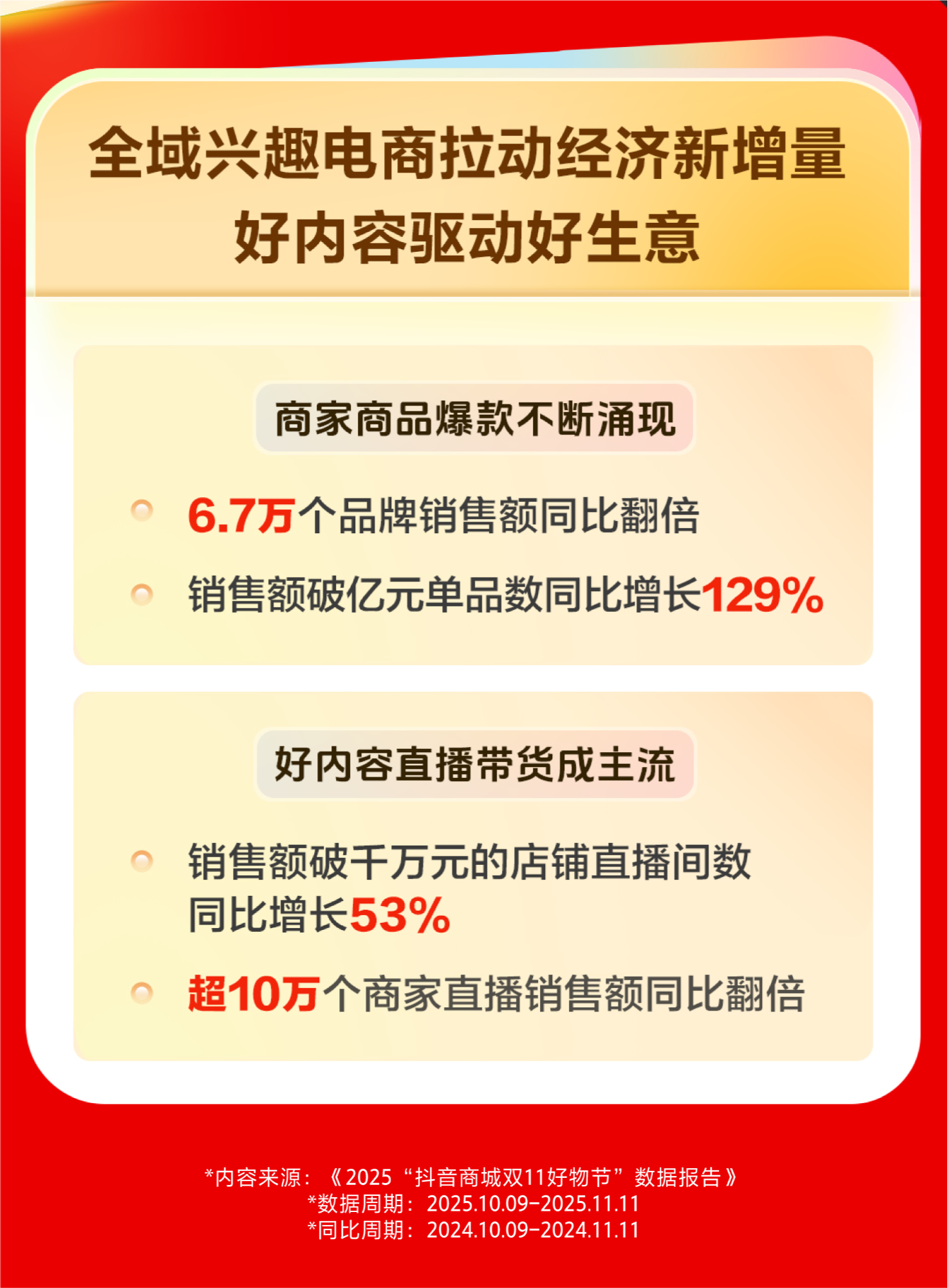 10月9日至11月11日,全域兴趣电商模式有效拉动实体经济新增量,平台上有6.7万个品牌销售额同比翻倍,超过10万商家直播销售额同比翻倍。